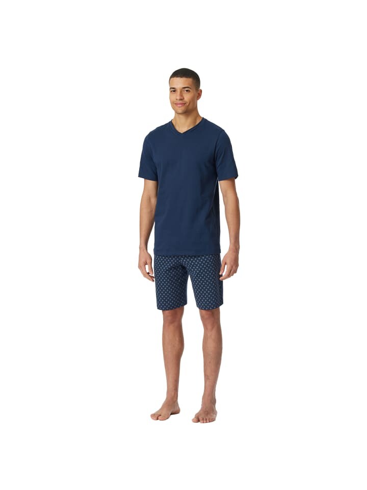Классические шорты для мужчин от бренда SCHIESSER. Однотонная рубашка с V-образным вырезом и шорты с рисунком из мягкого хлопкового трикотажа.