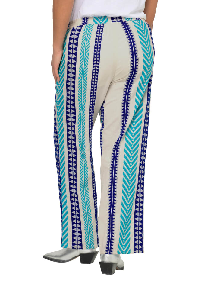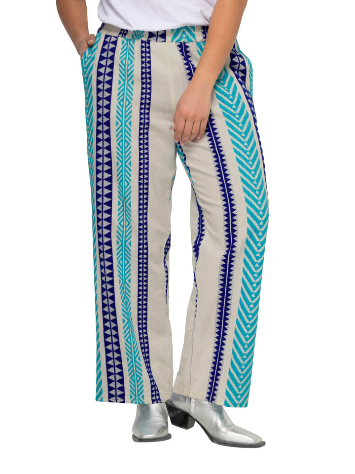 Брюки из жаккардовой ткани с узорными полосками. Удобная посадка, эластичный пояс и карманы в боковых швах. Внешний материал: 100% хлопок.