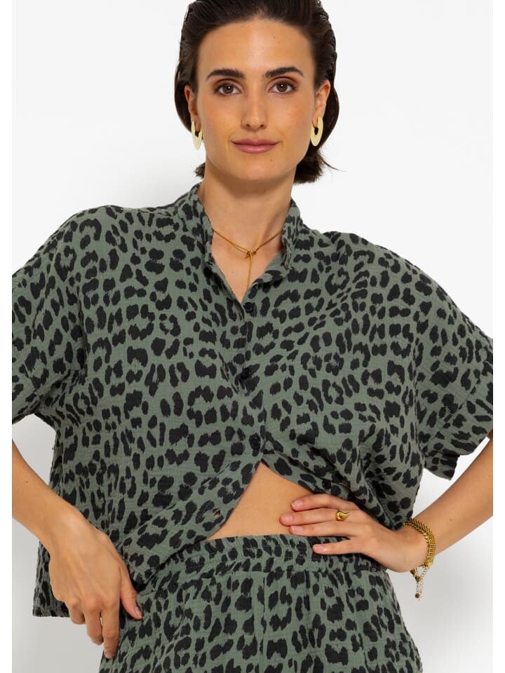 Эта муслиновая блузка укороченного кроя с красивым леопардовым принтом придает вам совершенно модный вид. Модель имеет классические детали, такие как воротник-стойка и планка во всю длину с фирменными дерзкими пуговицами. Короткие рукава с отделкой и крой оверсайз придают блузке спортивные детали. Для создания целостного образа доступны подходящие шорты того же дизайна.