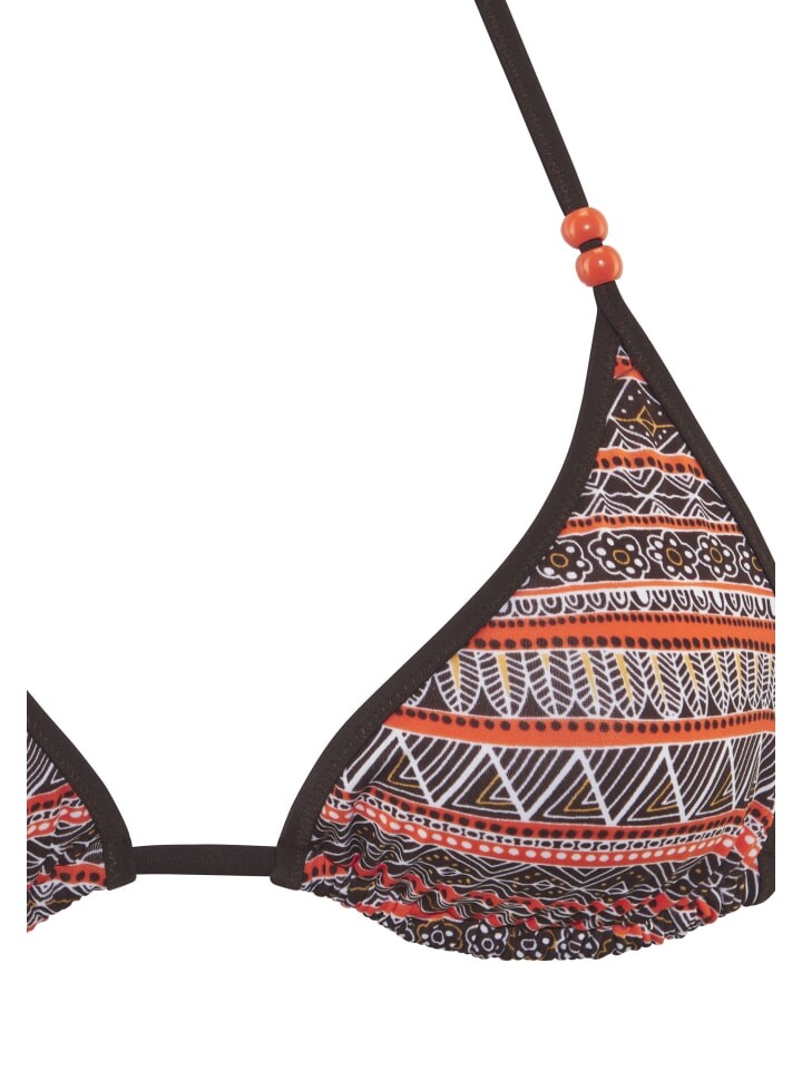 Треугольное бикини от Buffalo с модным принтом по всей поверхности и декоративными бусинами. Шейный держатель для завязывания. Съемные мягкие чашки. Плавки бикини классического кроя с завязками сбоку. Приятный материал.