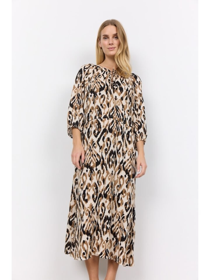 SC-FANG 3 — струящееся платье длины миди из 100% вискозы ECOVERO. Эластичная талия и манжеты, женственный воротник-стойка, длинные рукава и принт в стиле животных, придающий нотку игривости. Сочетайте его с обувью на плоской подошве или на высоком каблуке, чтобы создать элегантный образ, подходящий для разных случаев.