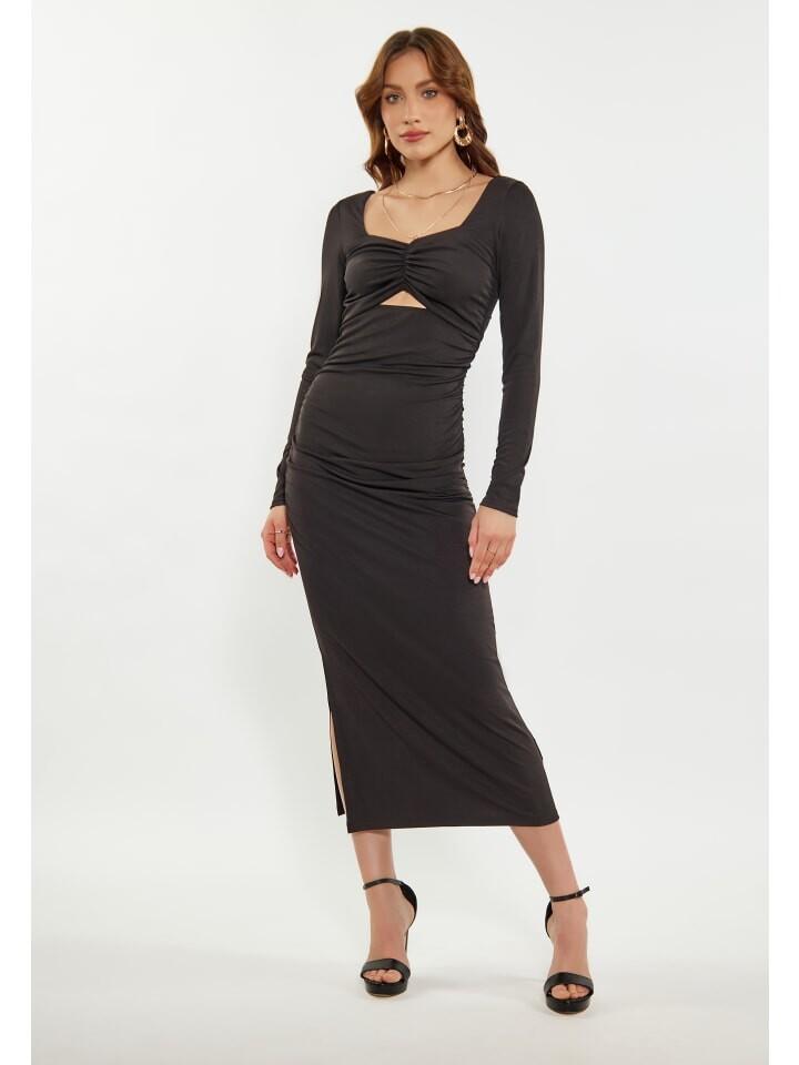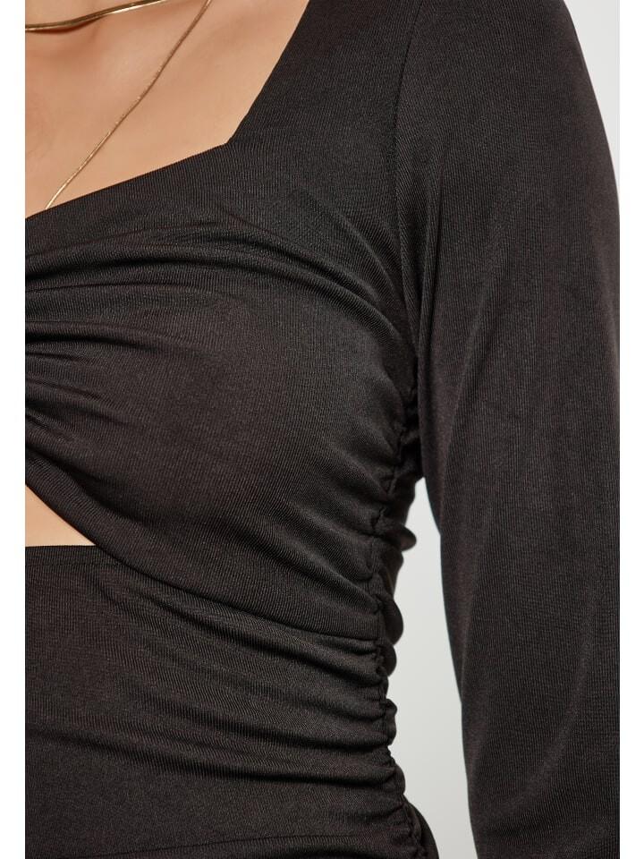 Подчеркните свой стиль с помощью этого облегающего платья с уникальным вырезом на груди и рюшами из ткани, создающими диагональную структуру на туловище. Круглый вырез горловины дополняет гладкую эластичную ткань, подчеркивающую ваши изгибы. В сочетании с туфлями на высоком каблуке с открытым носком создается элегантный образ.