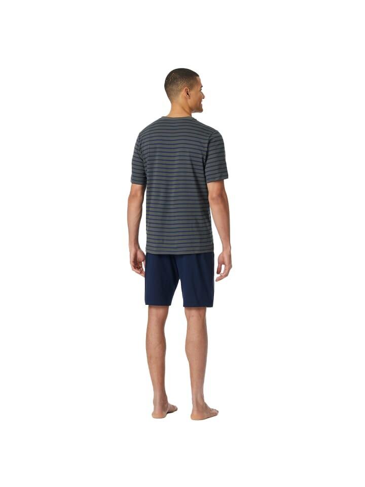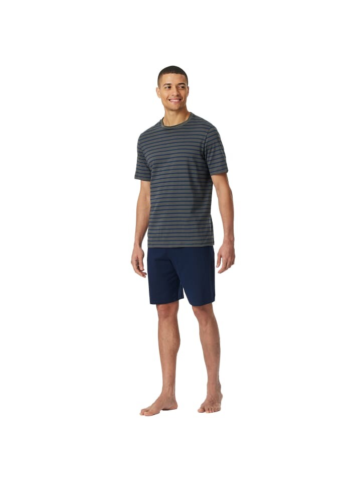 Классические шорты для мужчин от бренда SCHIESSER. Полосатая рубашка с круглым вырезом и однотонные шорты из мягкого хлопкового трикотажа.