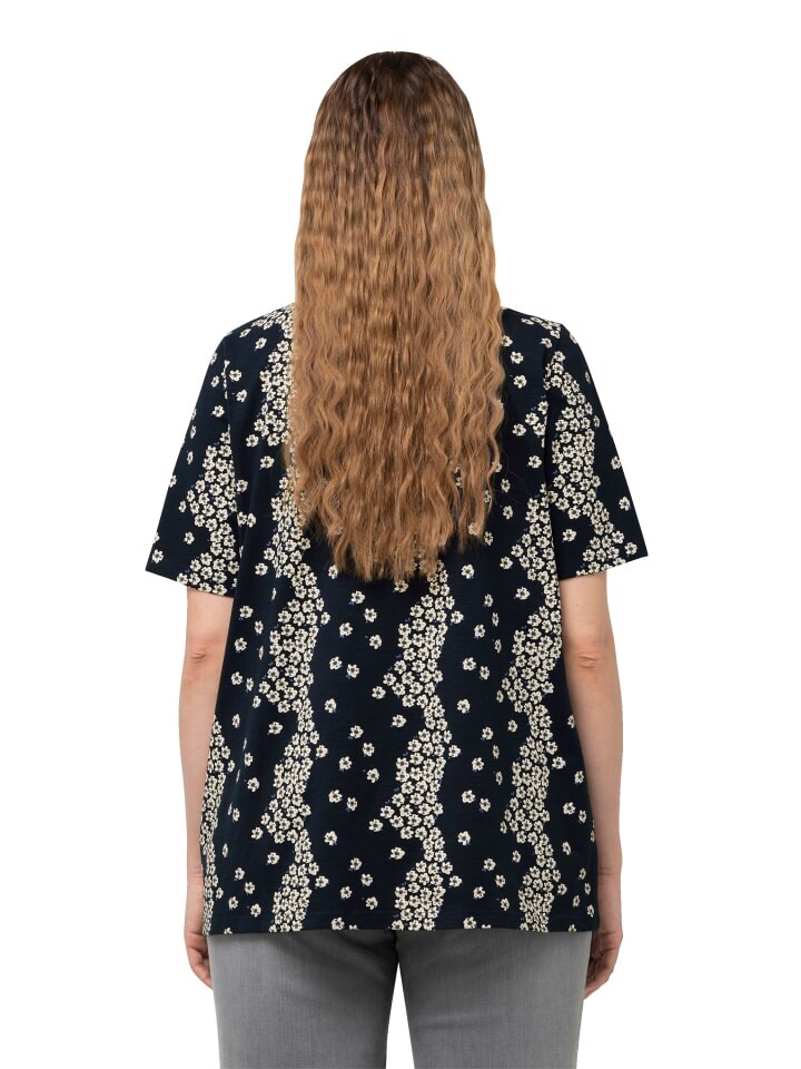 Футболка А-силуэта с цветочным узором. V-образный вырез с декоративными складками, полурукава.