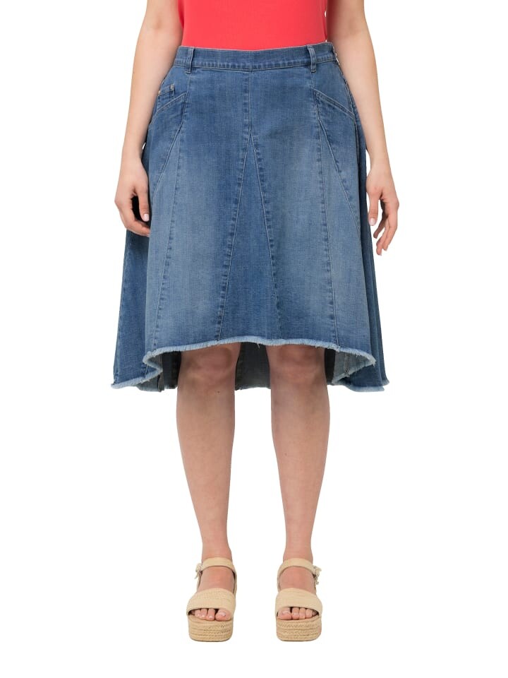 Джинсовая юбка А-силуэта из приятного эластичного денима со складками-годе и закругленным низом с бахромой, сзади длиннее примерно на 15 см. Частично эластичный пояс с петлями для ремня и боковой молнией. 2 кармана, дополнительный карман для монет.