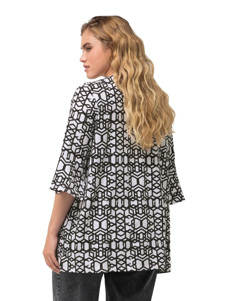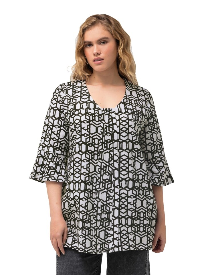 Футболка А-силуэта из мягкого трикотажа с графическим принтом. Декоративные складки под V-образным вырезом, полурукава с воланом.