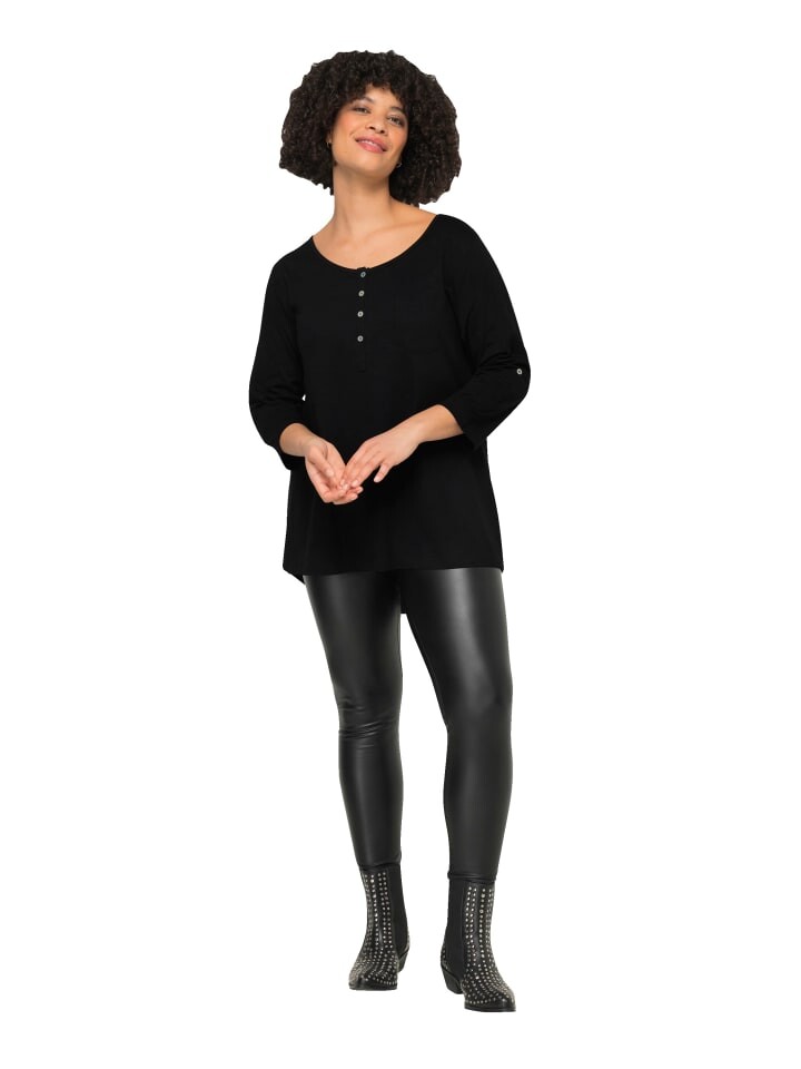 Футболка удобного кроя с тонкой структурой. Круглый вырез горловины с планкой на пуговицах, нагрудный карман, рукава 3/4 с отворотом для половины рукава. Подол сзади длиннее.