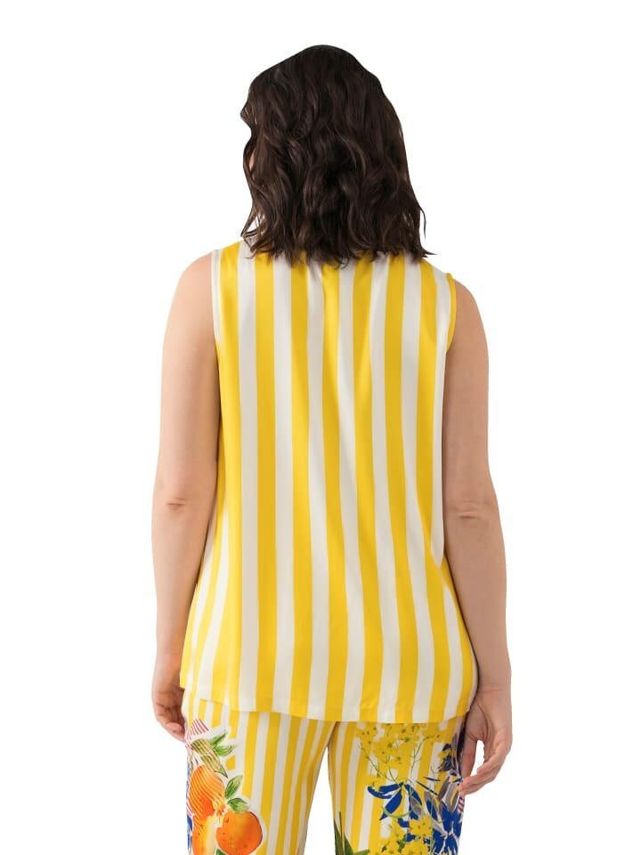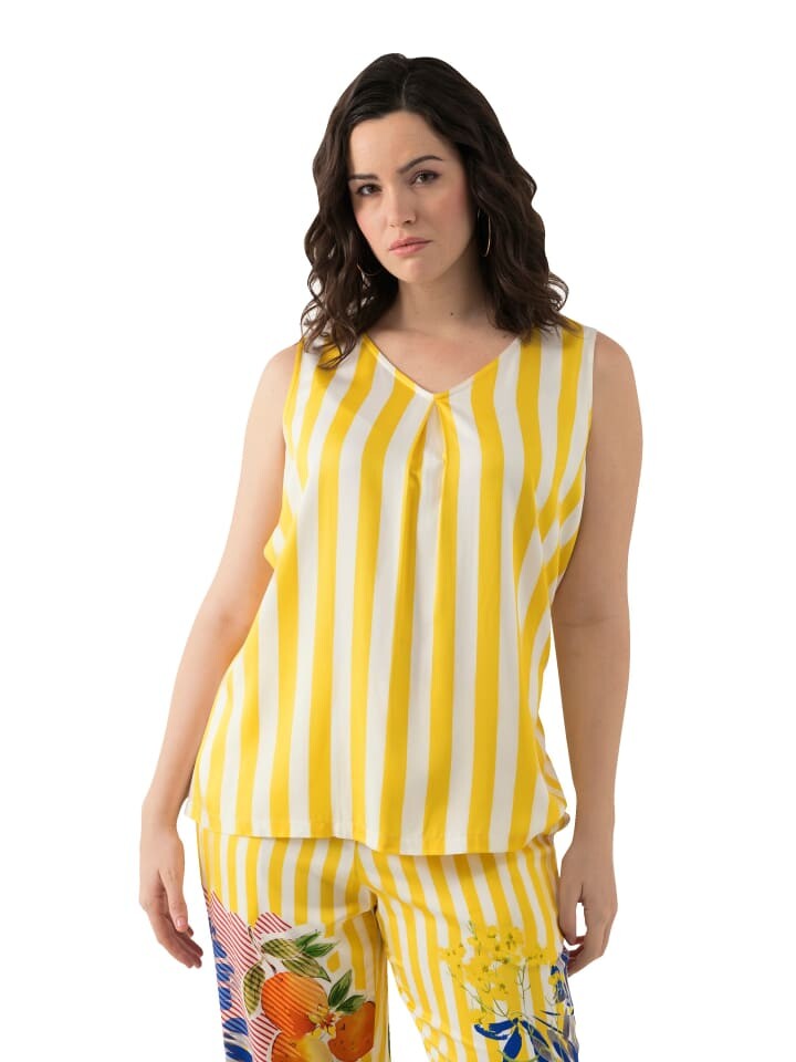 Верх блузки А-силуэта выполнен из мелко мерцающего вискозного атласа в полоску. V-образный вырез с декоративными складками, удобная ширина низа. Без рукавов.