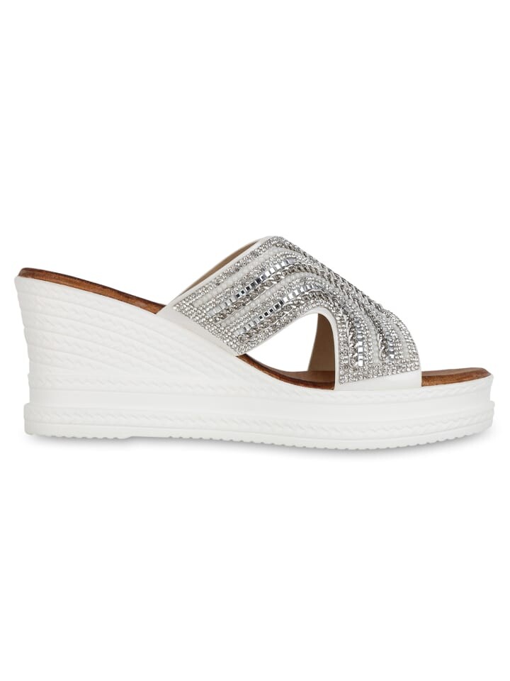 С моделью обуви: мюли – нет ничего лучшего. Обувь очень модная и прекрасно сочетается со многими нарядами. Женская обувь – популярный выбор по сезону: весна, лето. Обувь без подкладки. Стиль обуви: модный и привлекает внимание. Кроме того, практичный тип застежки: отсутствие застежки позволяет легко надевать и снимать. Еще одна изюминка — детали обуви: стразы, цепочки, передняя часть платформы. За этими сандалиями легко ухаживать, они долговечны благодаря материалу верха: пластику. Внутренний материал: синтетическая кожа обеспечивает удобную посадку, стелька: синтетическая кожа обеспечивает комфорт при ходьбе, а подошва поддерживает каждый шаг. Благодаря форме каблука: танкетка и высоте каблука: 8 см, а также носку: открытому спереди, эти туфли прекрасно сочетаются с любым образом и случаем.