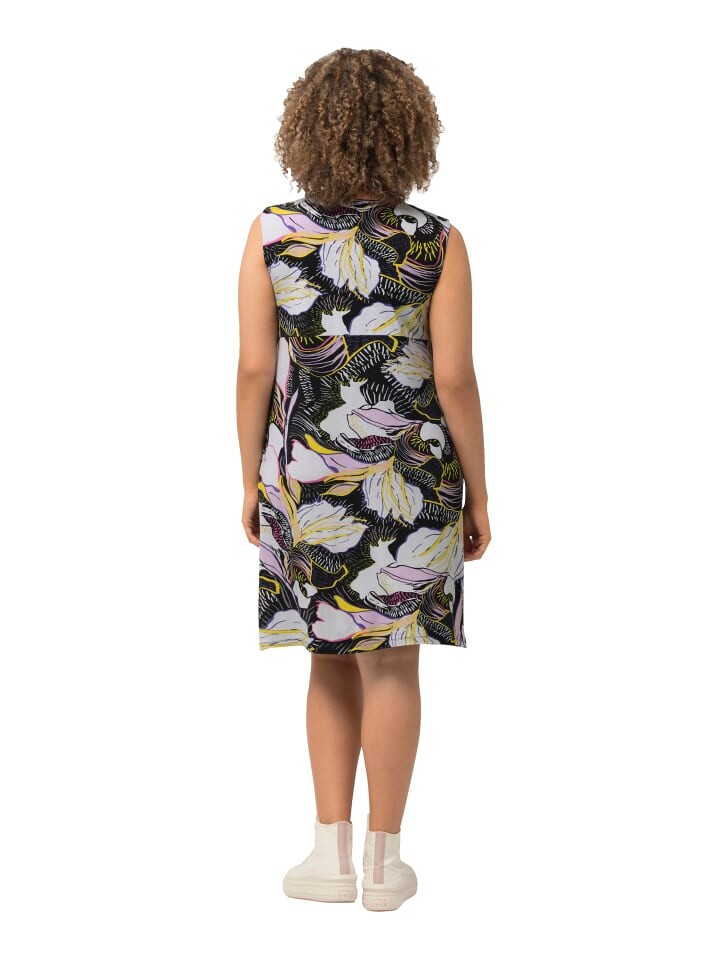 Мини-платье из джерси А-силуэта без рукавов, с крупным цветочным принтом и каймой по нижнему краю. Круглый вырез горловины, поперечный шов с рюшами, 2 накладных кармана.