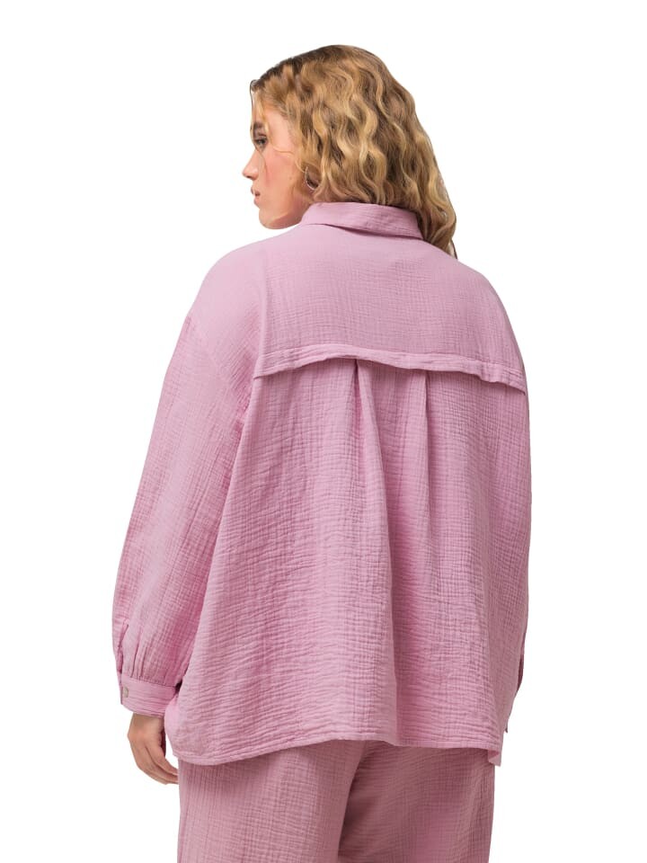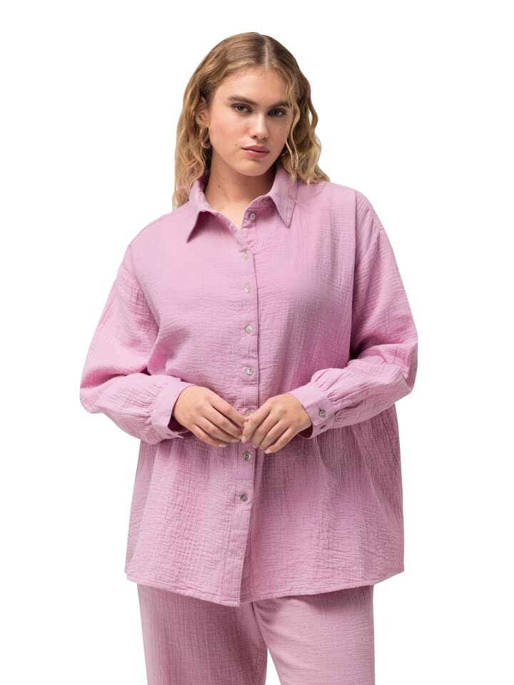 Блузка-рубашка из муслина, большого размера, тонкой структуры. Воротник рубашки, планка на пуговицах во всю длину и закругленный низ. Длинные рукава с манжетами. Внешний материал: 100% хлопок.