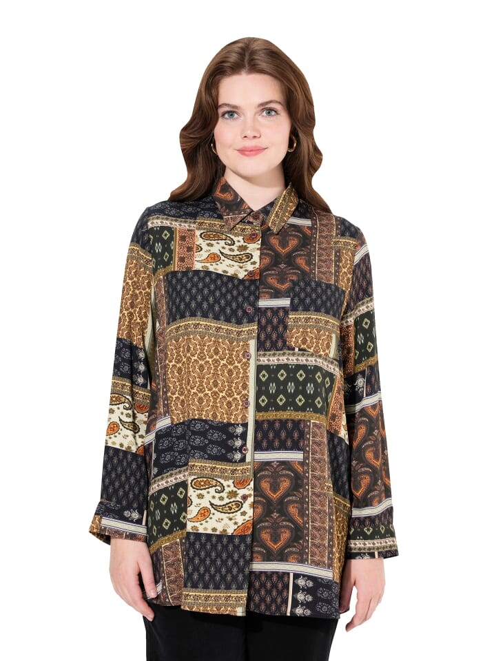 Блузка-рубашка, обычного кроя, с миксом узора «деревенский домик». Воротник рубашки, планка на пуговицах, нагрудный карман. Длинные рукава с манжетами. Закругленный низ.