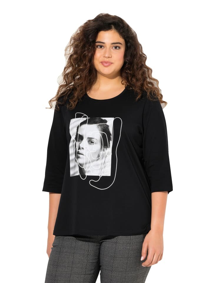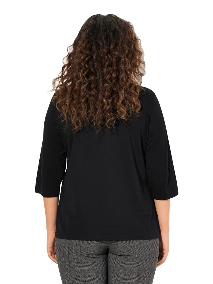 Футболка обычного кроя с декоративным мотивом. Круглая горловина, рукава 3/4. Боковые разрезы для плавного падения.