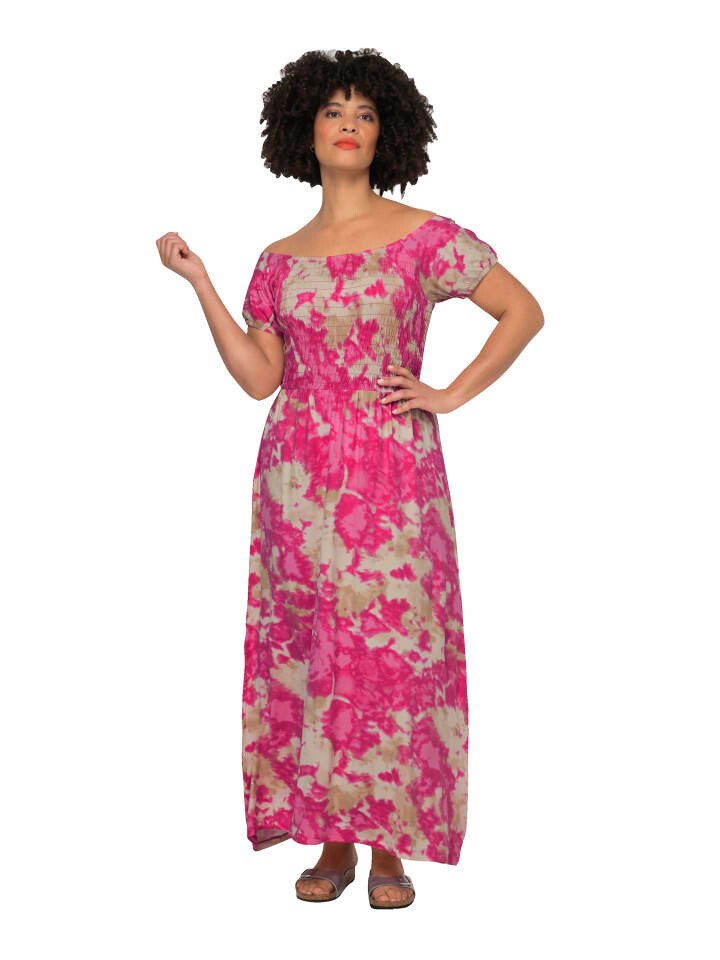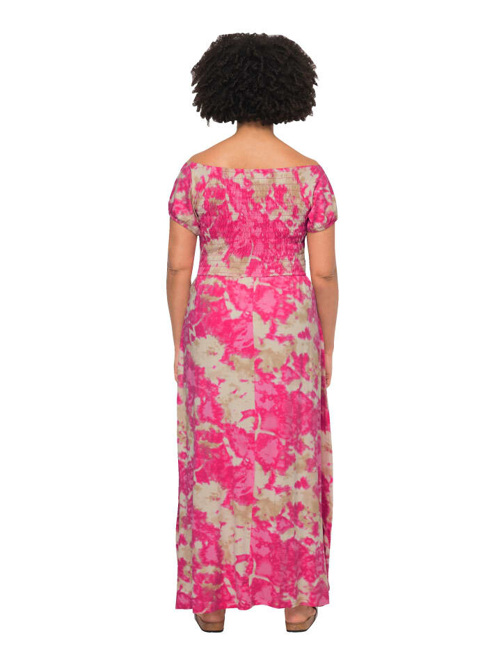 Трикотажное платье-макси из приятного эластичного вискозного трикотажа с принтом по всей поверхности. Широкий круглый вырез горловины с эластичной сборкой внизу. Полурукава.