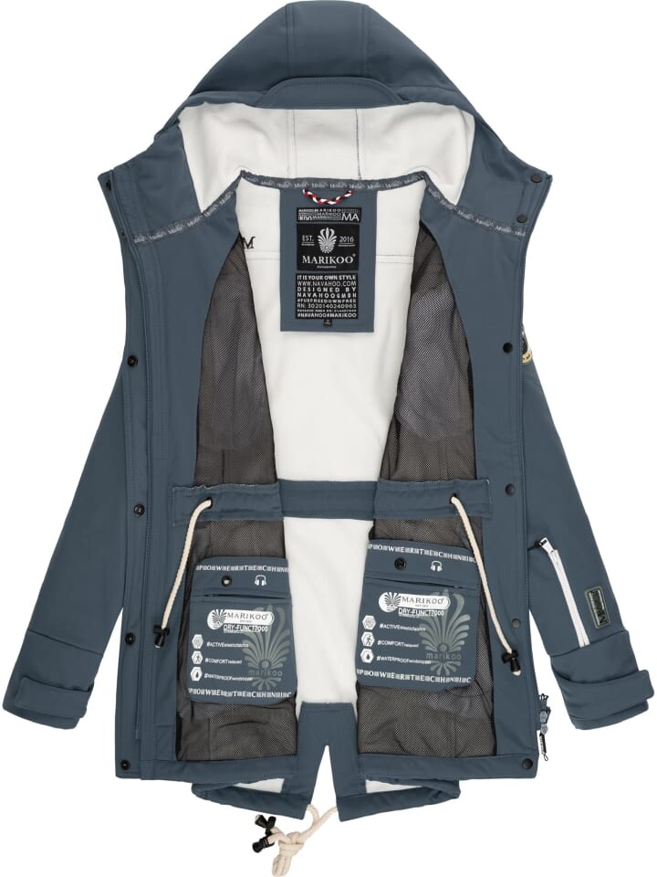 ВНЕШНИЙ ВИД: Спортивная женская парка из софтшелла от Marikoo с капюшоном на подкладке — отличный универсал для переменчивой погоды в переходный период (весна и осень). МАТЕРИАЛ: Особо прочный матовый мерцающий внешний материал всепогодной куртки дышащий. , ветрозащитный и водонепроницаемый (гидростатический напор 7000 мм), поэтому идеально подходит для любого активного отдыха (ветровка)