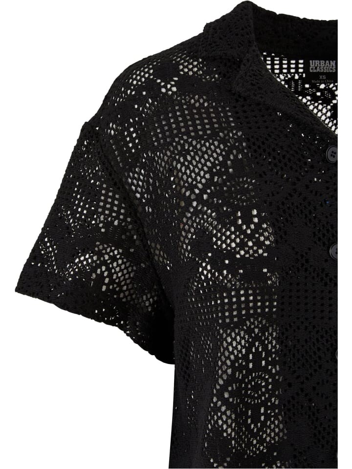 Женская блузка с короткими рукавами из прозрачного кружева очаровывает женственной изысканностью. Оно оснащено воротником с лацканами и планкой на пуговицах и заканчивается чуть выше бедер. Свободный крой с перекрытием плеч придает городской стиль. Женская блузка изготовлена из хлопка и полиамида.