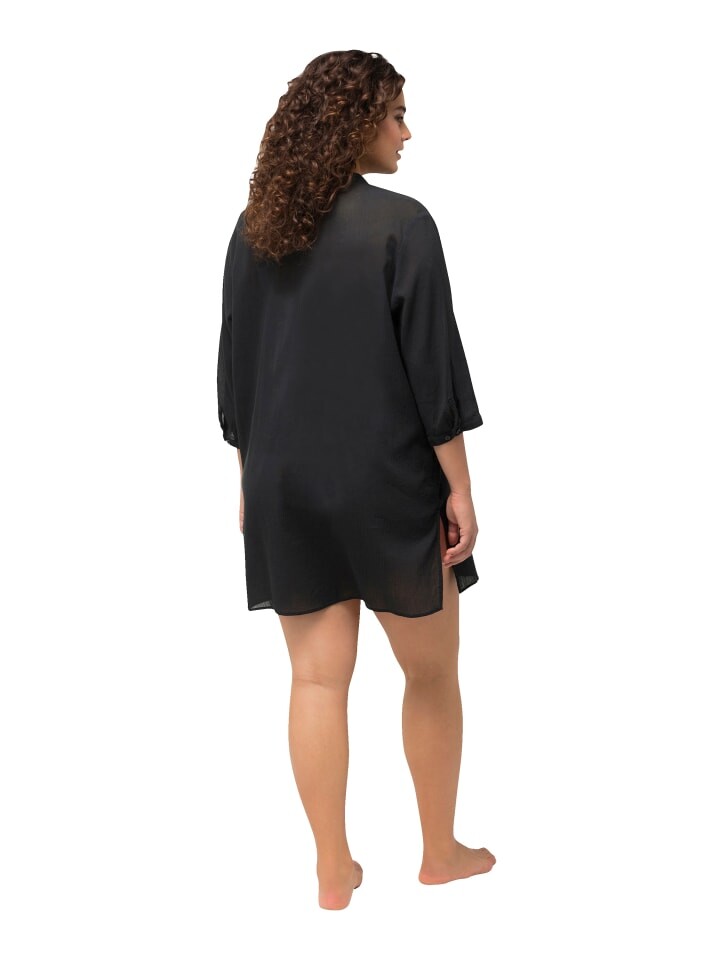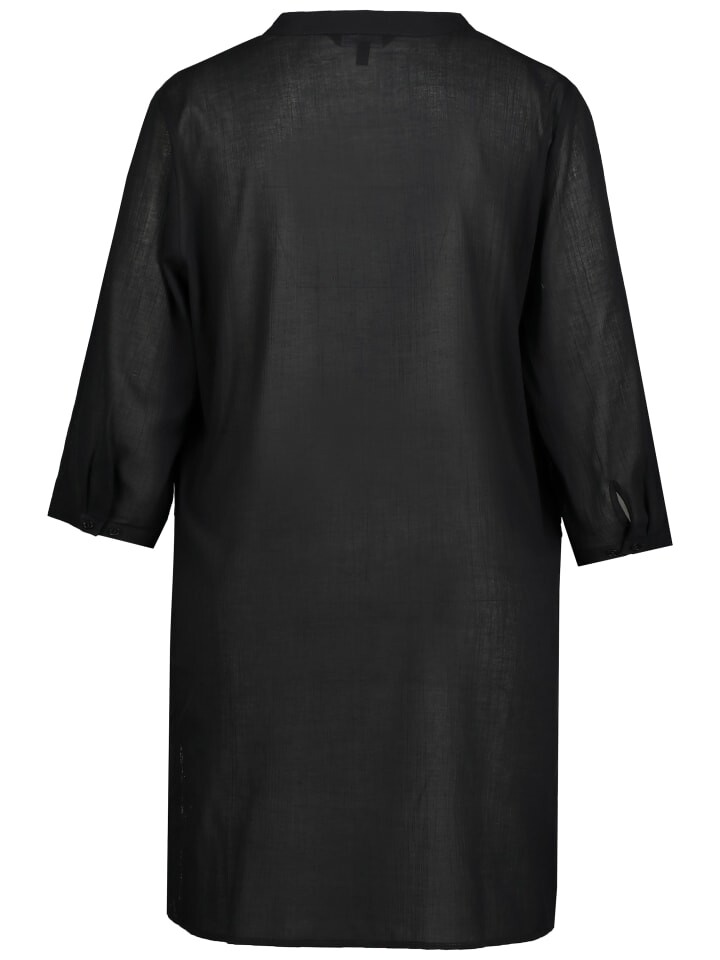 Пляжная блузка удобного широкого кроя. Слегка прозрачное качество с тонкой структурой. Воротник стойка, сзади слегка волан, планка на пуговицах, разрезы по бокам. Рукава 3/4 с манжетами. Внешний материал: 100% хлопок.