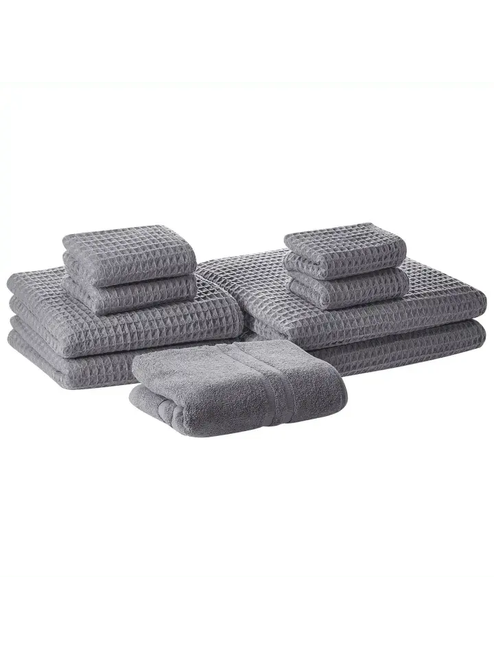 Модный набор полотенец из инновационной пряжи нулевой крутки с ковриком для ванной в тон. Этот комплект полотенец вафельной формы мгновенно станет вашим любимым. Вафельная структура придает полотенцам роскошный вид и идеально подходит в качестве гостевых полотенец. Они сотканы без скручивания и имеют плотные волокна, которые кажутся очень мягкими и теплыми. Благодаря изогнутой структуре влага быстро впитывается кожей, и полотенце высыхает за короткое время. В комплект входят гостевые полотенца, полотенца для рук, банные полотенца и коврик для ванной в тон.