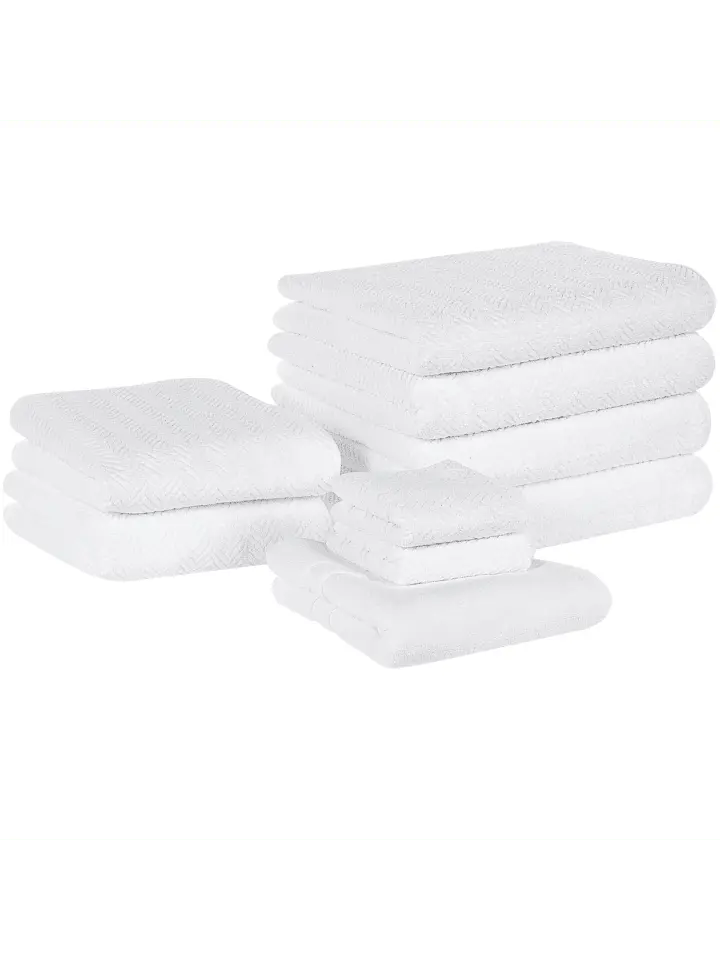 Роскошный комплект полотенец с ковриком для ванной из высококачественного хлопка. Позвольте себе побаловать себя после ванны или душа. Этот роскошный комплект полотенец изготовлен из высококачественной хлопчатобумажной пряжи, которая порадует вас своей мягкостью. Чесаная тонкая пряжа является идеальным материалом для любой ванной комнаты благодаря своим сверхмягким на ощупь, впитывающим и быстросохнущим свойствам. Полотенца украшены изящным зигзагообразным узором и имеют усиленные края, что не только придает им элегантный вид, но и защищает от истирания.