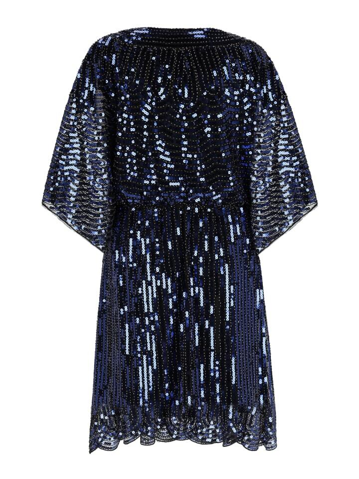 Обновите свой формальный наряд этим потрясающим платьем. Благодаря V-образному вырезу и коротким драпированным рукавам оно излучает элегантность. Блестки аккуратно расположены разной плотности, создавая завораживающий фактурный эффект. Благодаря свободному крою и подолу длиной до колена это изделие создает непринужденный, но утонченный силуэт.