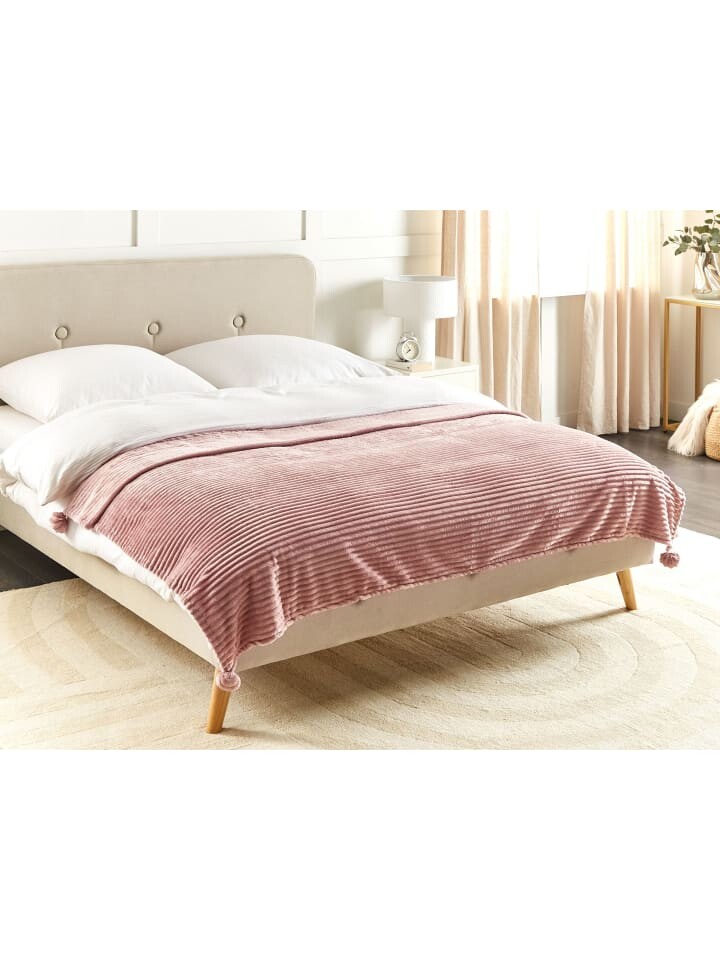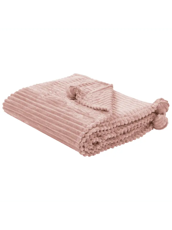 Пушистое покрывало розового цвета. Прохладные летние ночи или холодные зимние дни – это уютное одеяло приглашает вас чувствовать себя хорошо! Благодаря полосатому виду, мелким помпонам и особой мягкости это не просто одеяло. Его вневременной стиль также может быть легко интегрирован в различные стили дизайна интерьера.