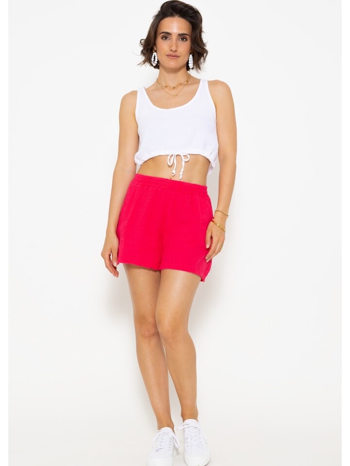 Этот летний, дерзкий укороченный топ из мягкого хлопкового муслина имеет широкий круглый вырез, свободный крой, модель без рукавов и укороченную длину. Изюминкой верха является кулиска по подолу, которую можно собрать индивидуально. Носите его с классными джинсами и кроссовками, чтобы создать повседневный образ.