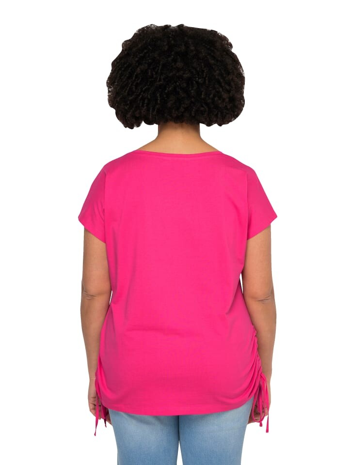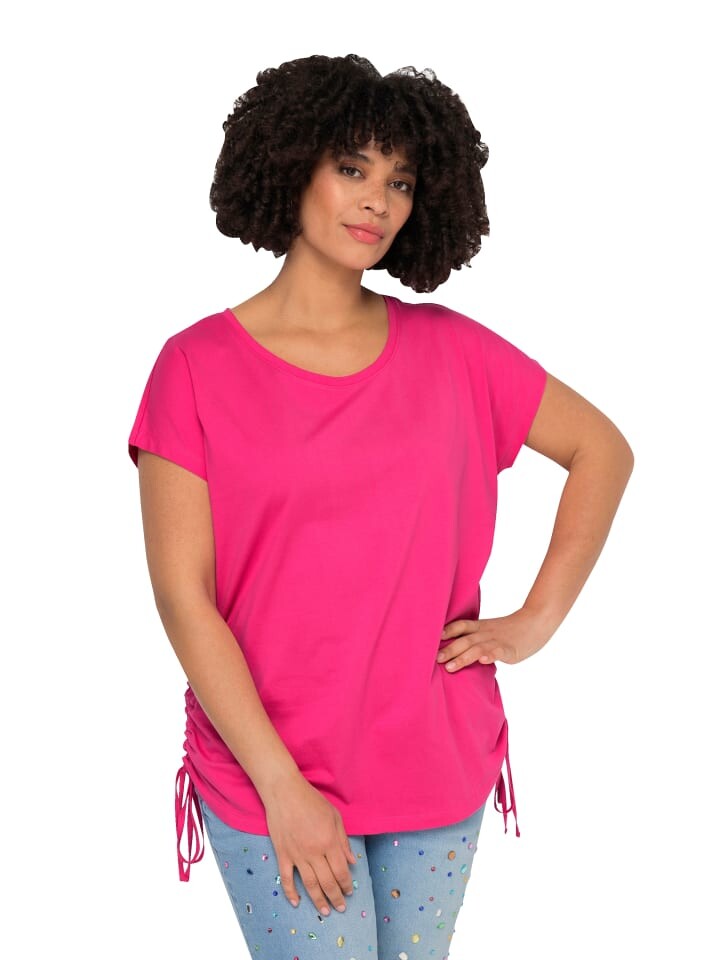 Футболка оверсайз, с рюшами по бокам и завязками – всегда ваш желаемый силуэт. Круглый вырез, заниженная линия плеча.