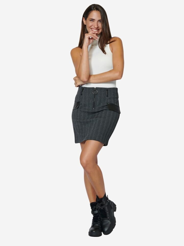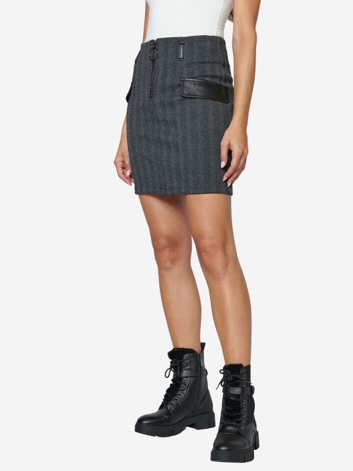 Юбка прямого кроя. Длинна выше колена. Шипованный принт. Застежка-молния спереди. Карманы с клапанами. Съемная деталь цепочки. Состав 53% Полиэстер, 44% Вискоза, 3% Эластан.
