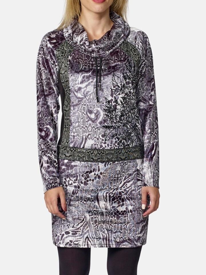Прямое платье с принтом. Регулируемый воротник-стойка с кулиской. Длинные рукава реглан. Длина до колена. Контрастные детали с флоковым принтом. Контрастный вырез на талии. Состав 95% Полиэстер 5% Эластик