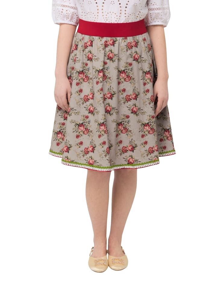 Традиционная юбка А-силуэта приятного мягкого качества с декоративным принтом. Пояс на резинке, подол декоративными лентами и кружевом. Карманы в боковых швах.