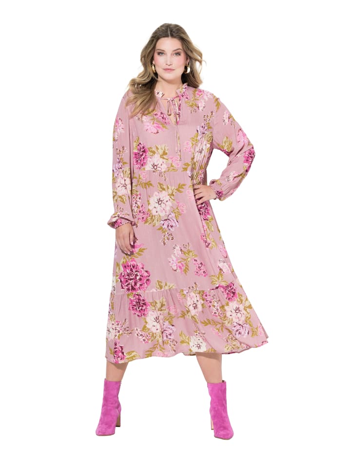 Платье миди А-силуэта из мягкой вискозы с цветочным узором. Круглый вырез горловины с рюшами, разрезом и пуговицей. Эластичная талия, волан по низу, длинные рукава с эластичными манжетами. Внешний материал: 100% вискоза.