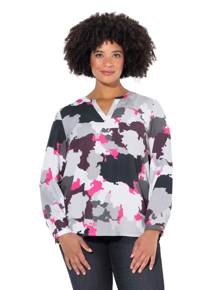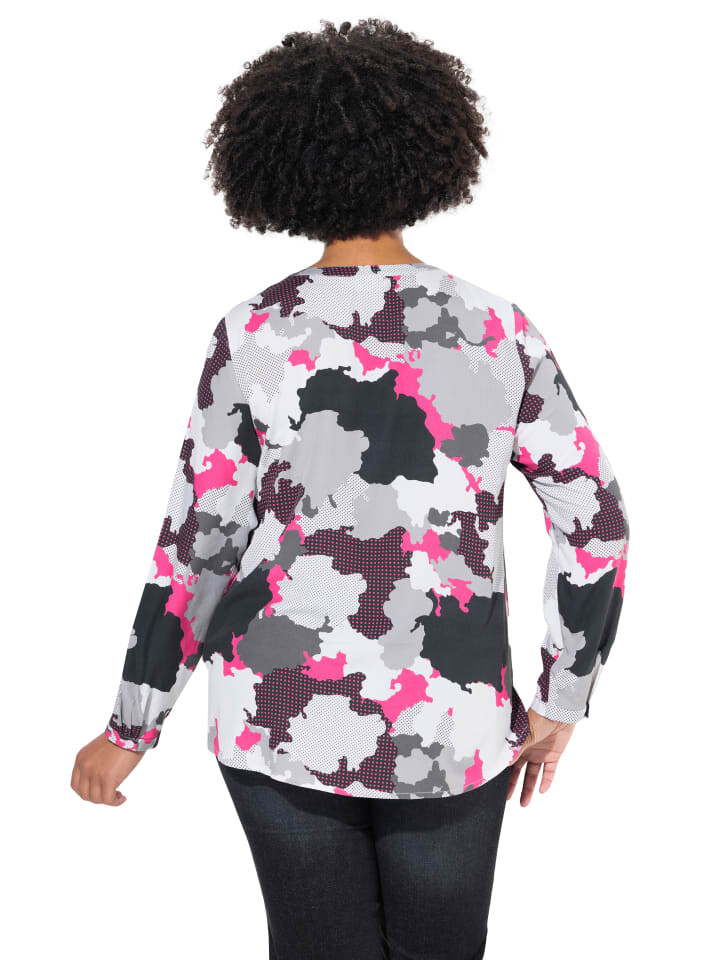 Блузка из мягкой вискозы с камуфляжным принтом. Вырез туники с планкой на пуговицах, длинные рукава с манжетами. Подол сзади примерно на 3 см длиннее.