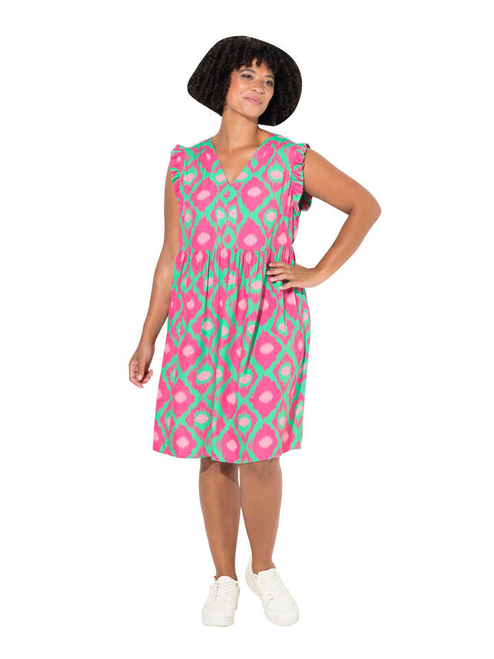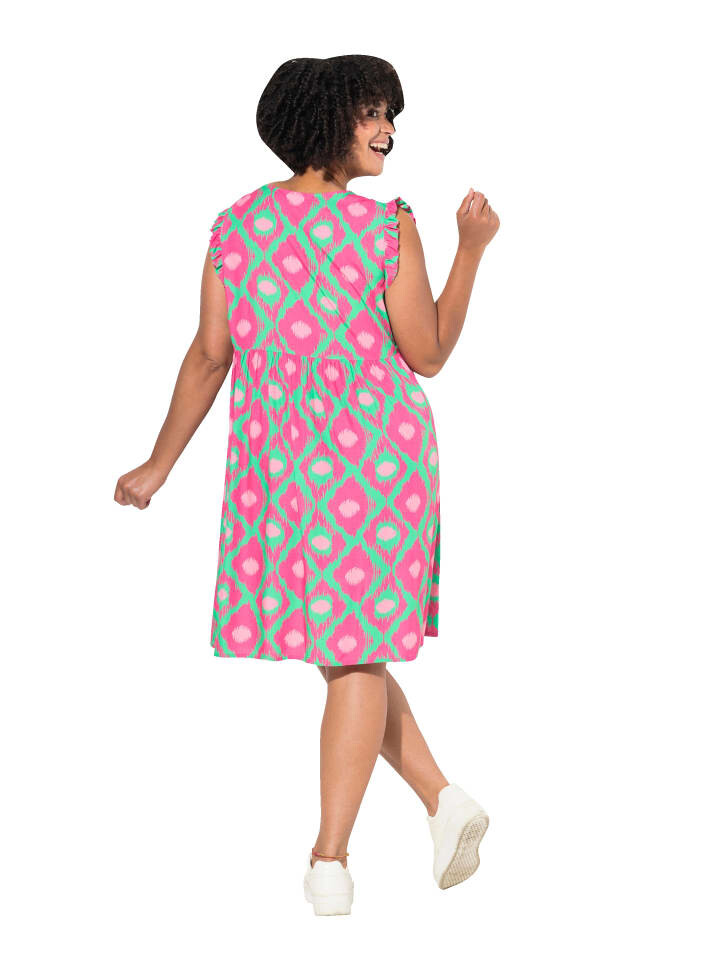 Платье удобное, без рукавов, из мягкой вискозы с принтом по всей поверхности. V-образный вырез, эластичный поперечный шов под грудью, оборки на рукавах. Волан по низу.