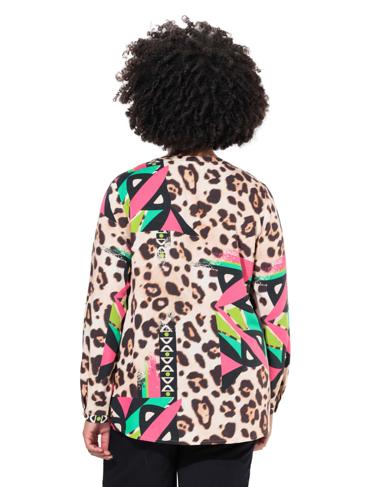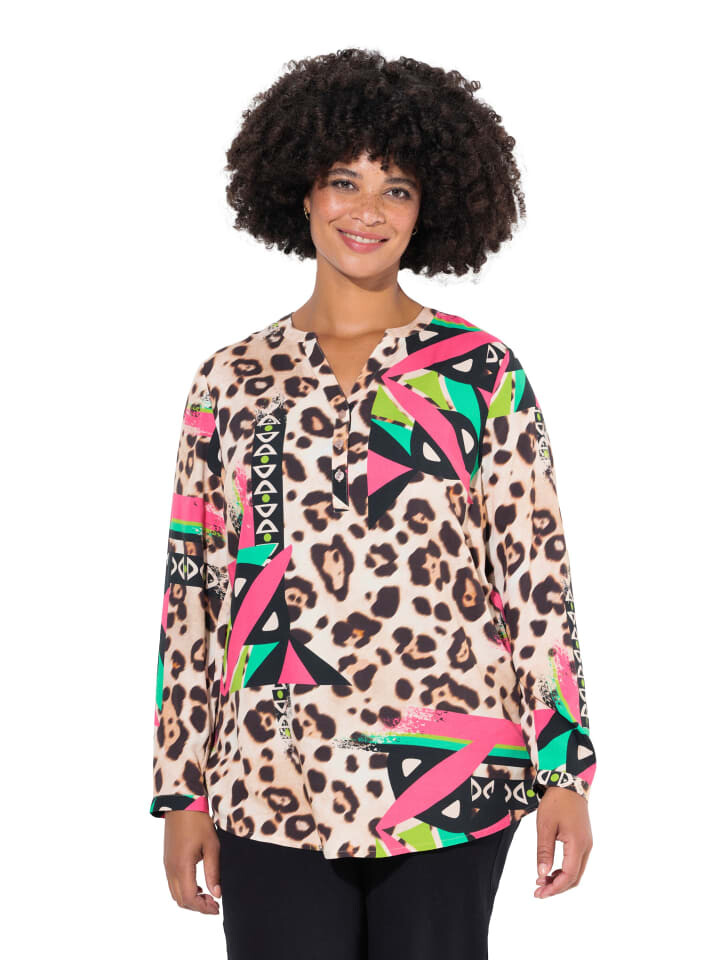 Блуза прямого кроя из мягкой вискозы с леопардовым принтом и цветными деталями. Вырез туники с планкой на пуговицах, слегка закругленный низ. Длинные рукава с манжетами. Внешний материал: 100% вискоза.
