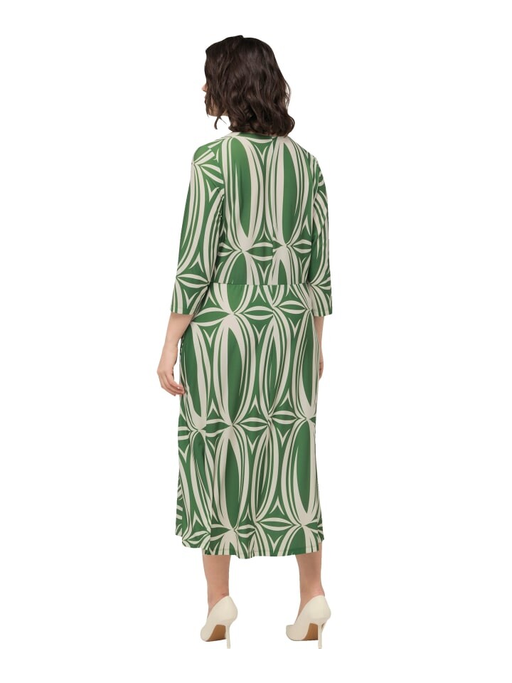 Платье миди из трикотажа с графическим узором. V-образный вырез с запахом вверх до поперечного шва, удобная ширина подола. Рукава 3/4.