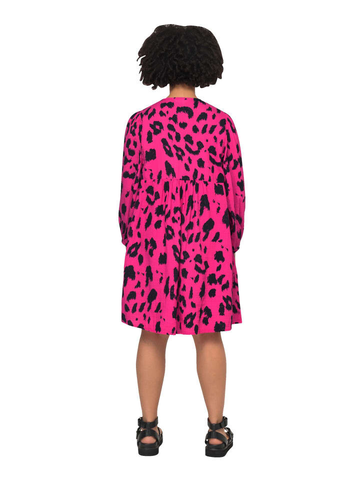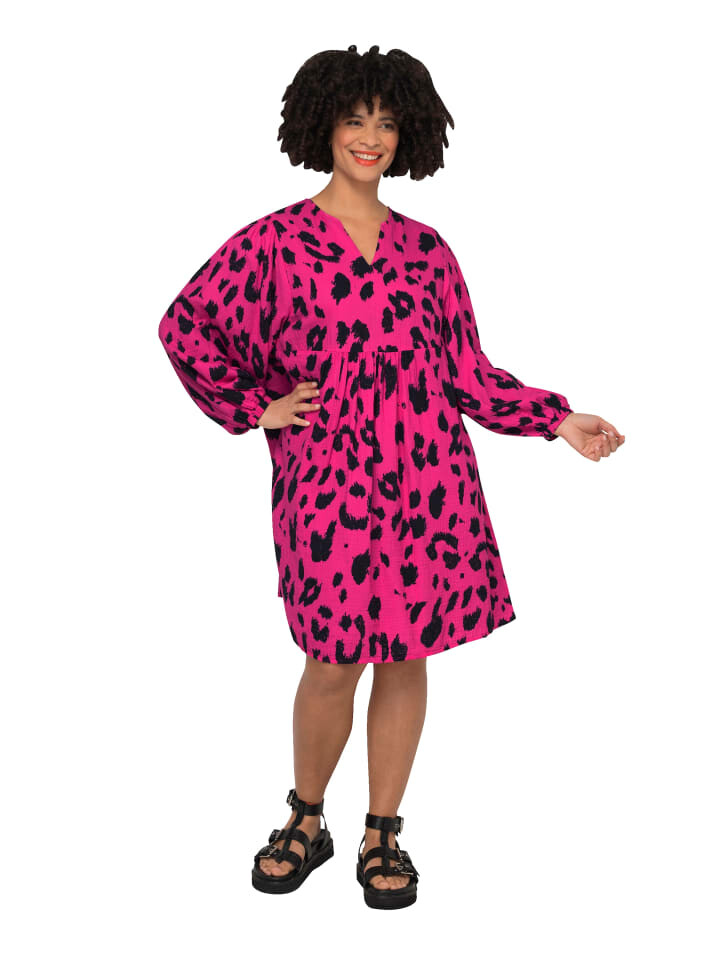 Муслиновое платье удобного кроя с цветным леопардовым принтом и тонкой структурой. Вырез туники со вставкой, широкие рукава-фонарики с манжетами. Двойная оборка по краю.