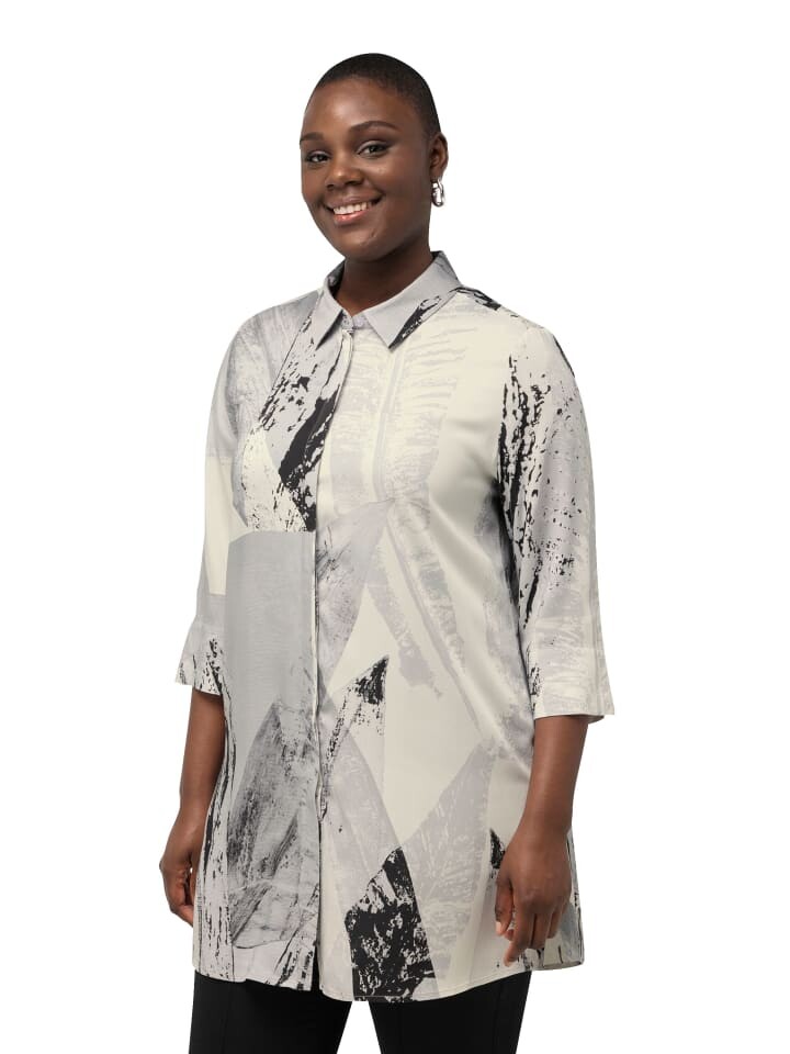 Длинная блузка длинного классического кроя из мягкой вискозы с воздушным узором из перьев размера XL. Воротник рубашки, планка на потайных пуговицах, рукава 3/4 с разрезом. Боковые разрезы для плавного падения.