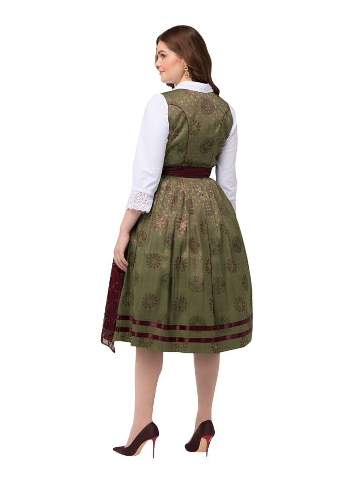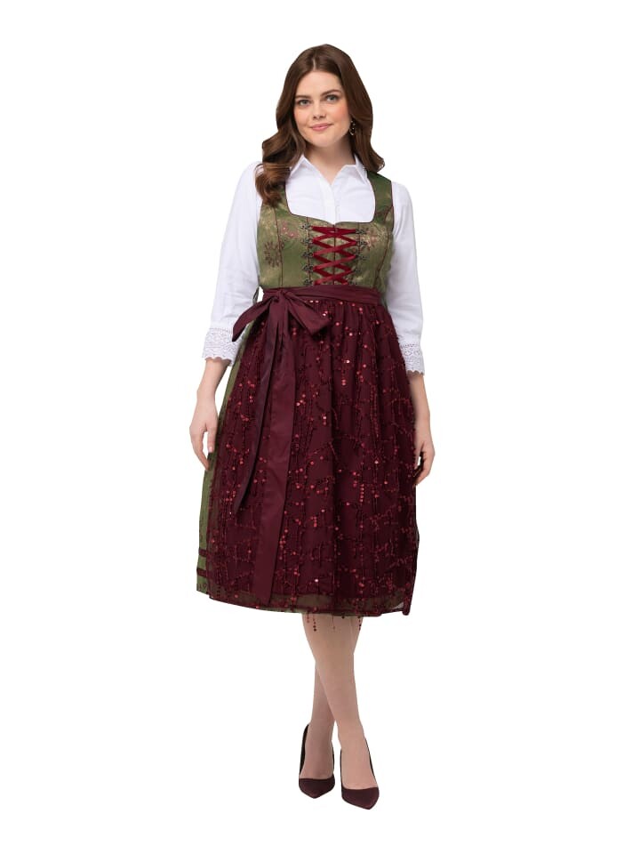 Дирндль с элегантным, мерцающим орнаментом. Непрерывная молния с тонким швом. Отделка окантовкой по краям. Без рукавов. Квадратный вырез и широкая юбка. Карманы в боковых швах, атласный фартук в тон с кружевом, блестящими пайетками и бантом.