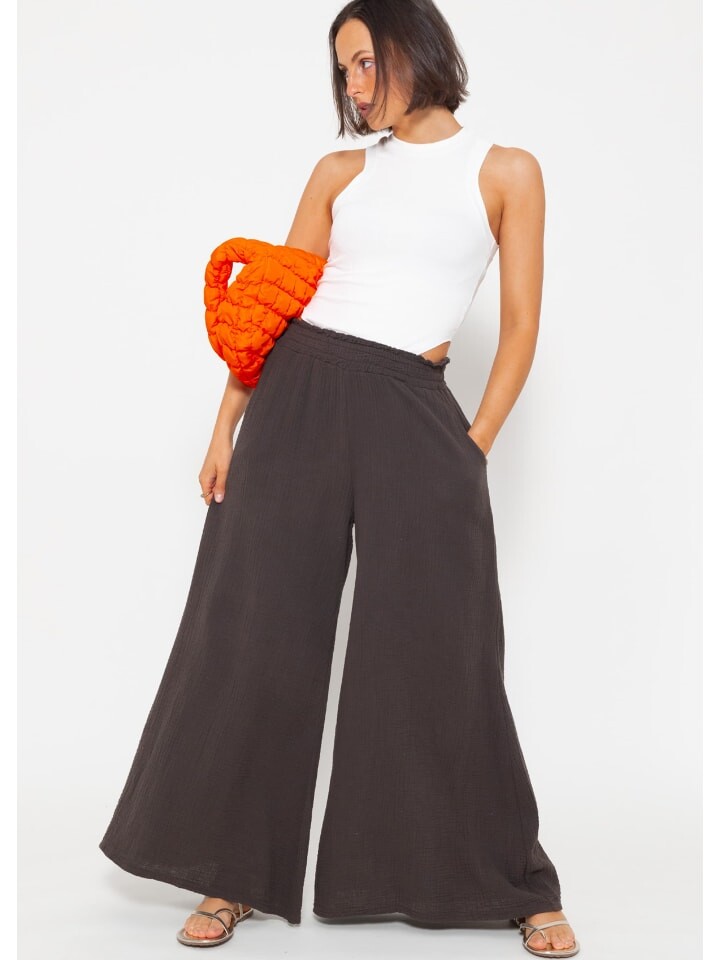 Широкие муслиновые брюки светло-бежевого цвета. Очень широкая штанина и свободный крой обеспечивают невероятную свободу движений и создают стильный и удобный образ. Высокий пояс с резинкой обеспечивает оптимальную посадку. Модель имеет скошенные боковые карманы, которые придают брюкам прохладный вид, а длинные струящиеся штанины добавляют элегантности. Практичная модель без шнуровки изготовлена в Италии из муслинового хлопка и поэтому создает воздушный дизайн. К этим брюкам мы рекомендуем приталенный базовый укороченный топ или универсальный топ, а также муслиновую блузку такой же структуры.