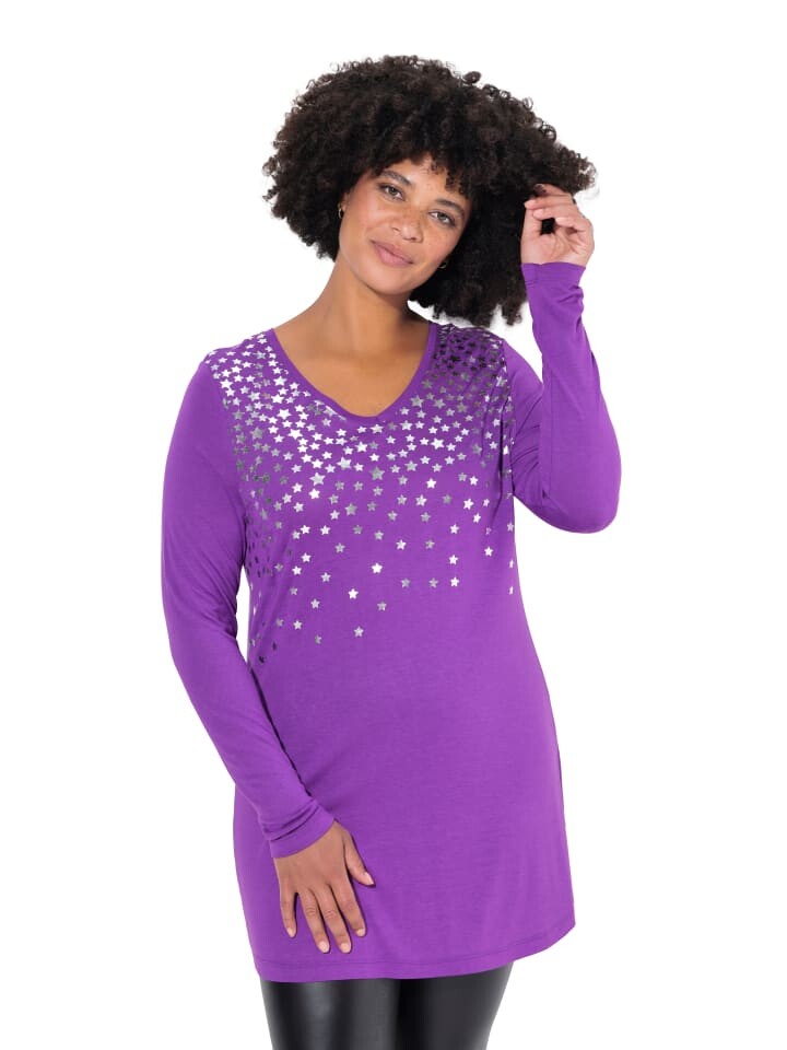 Футболка А-силуэта из мягкого трикотажа с блестящим принтом в виде серебряной звезды. V-образный вырез, длинные рукава.