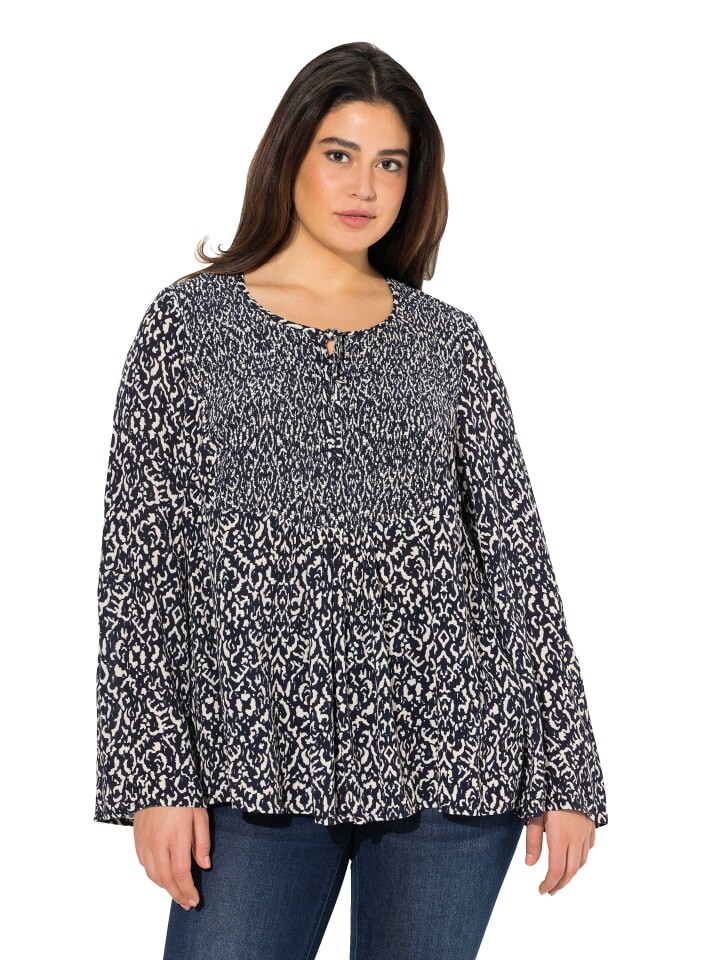 Блузка удобного кроя, с узором по всей поверхности и эластичным присборенным бюстом. Круглый вырез с разрезом и завязывающимся ремешком, широкие длинные рукава.