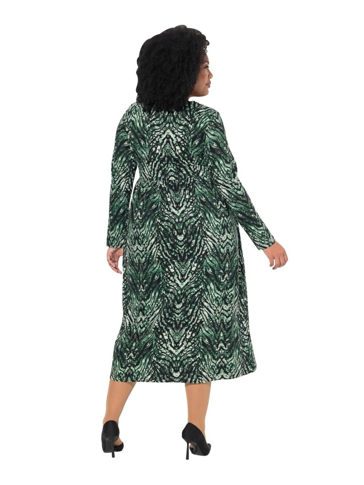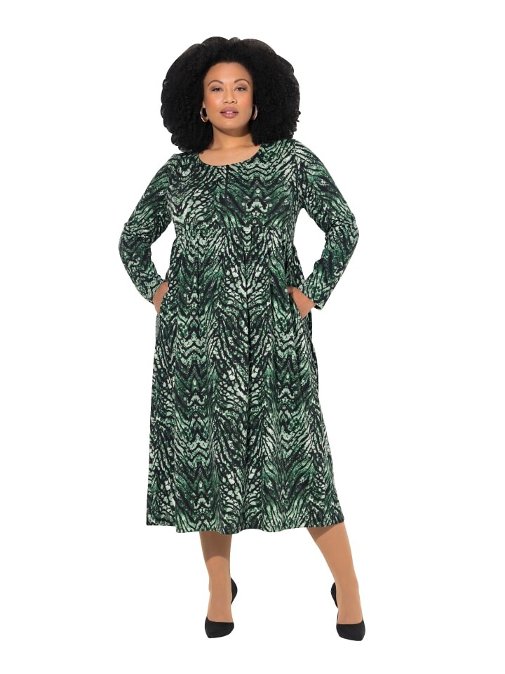 Трикотажное платье А-силуэта из чистого хлопка со змеиным узором. Круглый вырез горловины на молнии, эластичный ампирный шов под грудью, карманы в боковых швах. Длинный рукав.