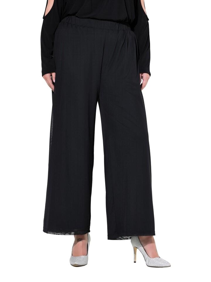 Брюки из сетки, прямые широкие брючины, двухслойные. Широкие брюки из прозрачной сетки с открытыми боковыми швами. Внизу брюки из непрозрачного трикотажа с эластичным поясом.