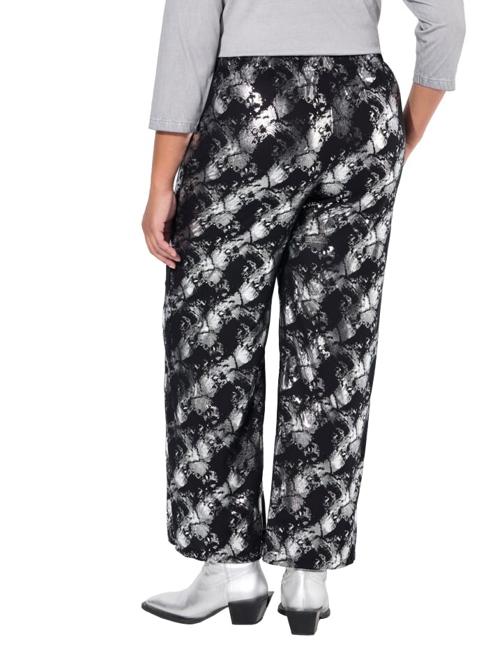 Брюки прямые, широкие, из мягкой вискозы с блестящим металлизированным принтом и эластичным поясом. Боковые карманы.