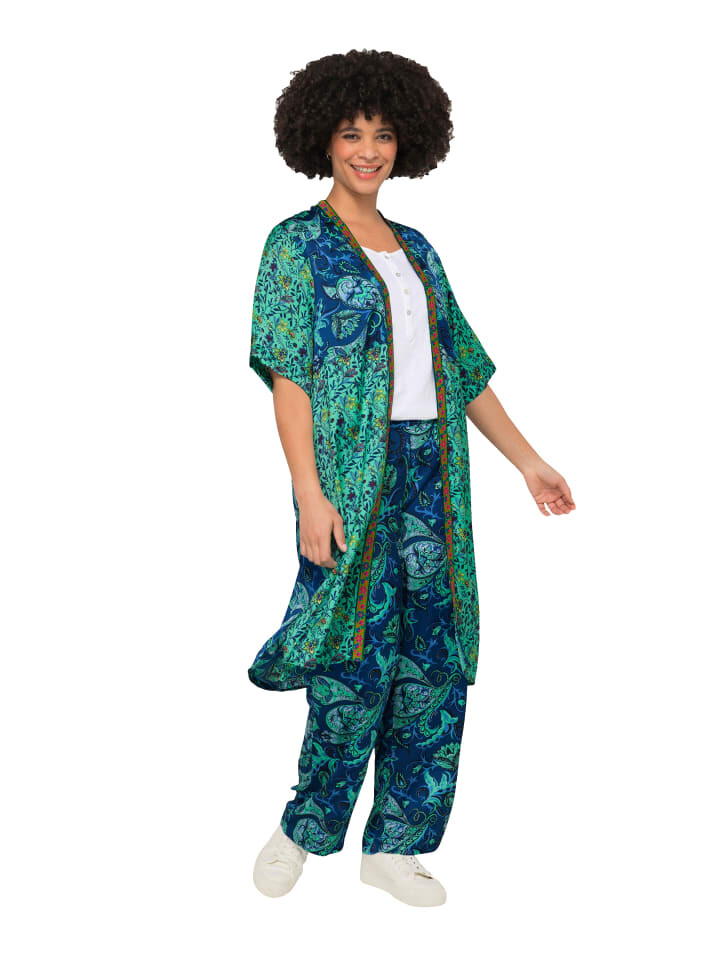 Кафтан оверсайз из мерцающего атласа с миксом узоров. Открытая форма со спущенной линией плеч и широкими рукавами 3/4. Закругленный низ.