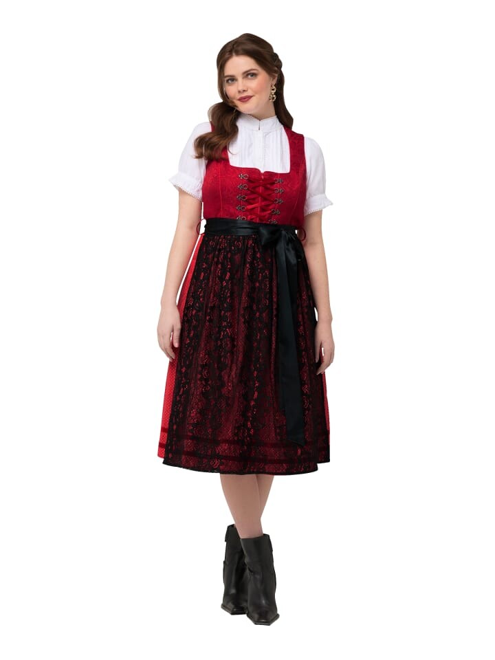 Дирндль с кружевным фартуком. Без рукавов, с молнией во всю длину и типичной декоративной шнуровкой. Отделка окантовкой по краям. Квадратный вырез, широкая юбка в горошек. Карманы в боковых швах.