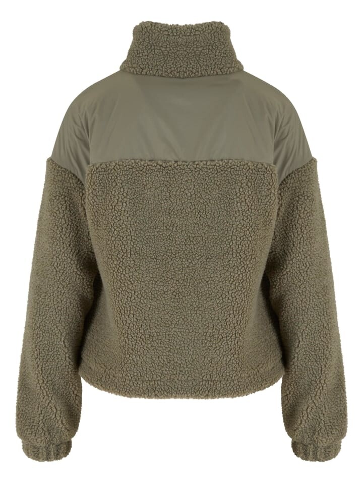 Легкая женская куртка из пушистого шерпа расставляет яркие акценты гладкими нейлоновыми вставками - в области плеч и нагрудного кармана. Имеет высокий воротник-стойку и застегивается на молнию. Боковые карманы – еще одна практичная деталь. Нагрудный карман оснащен вертикальной молнией. Куртка из шерпы имеет крой oversize со слегка завышенными плечами. Придать ему форму можно с помощью эластичной кулиски со стопором по краю. Эластичные манжеты обеспечивают поддержку. Женская куртка на сетчатой подкладке.