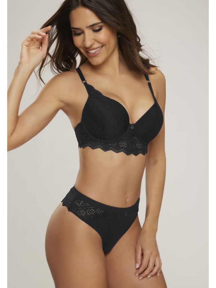 Отличные стринги с красивым кружевным поясом. Изготовлен из мягкого материала microtouch и прозрачного кружева с графическим рисунком. С прекрасным аксессуаром в центре спереди. Со встроенной хлопковой ластовицей. В наличии бюстгальтер из этой же серии. Внешний материал: 86 % полиамид, 14 % эластан.