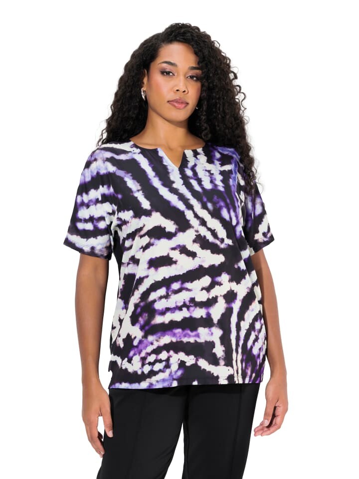 Блуза-рубашка, оверсайз. Спереди из мерцающего атласа тай-дай. Вырез-туника, заниженная линия плеча, полурукава. Спинка из трикотажа (95% вискоза, 5% эластан).