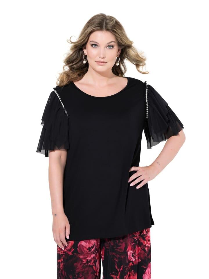 Футболка А-силуэта из мягкого трикотажа с полурукавами из прозрачной сетки с воланами. Круглый вырез.